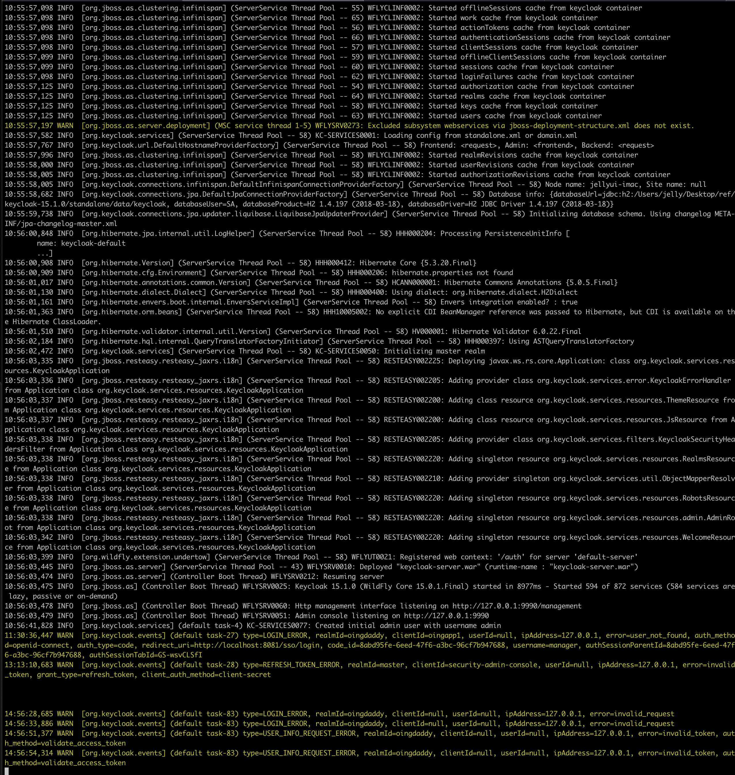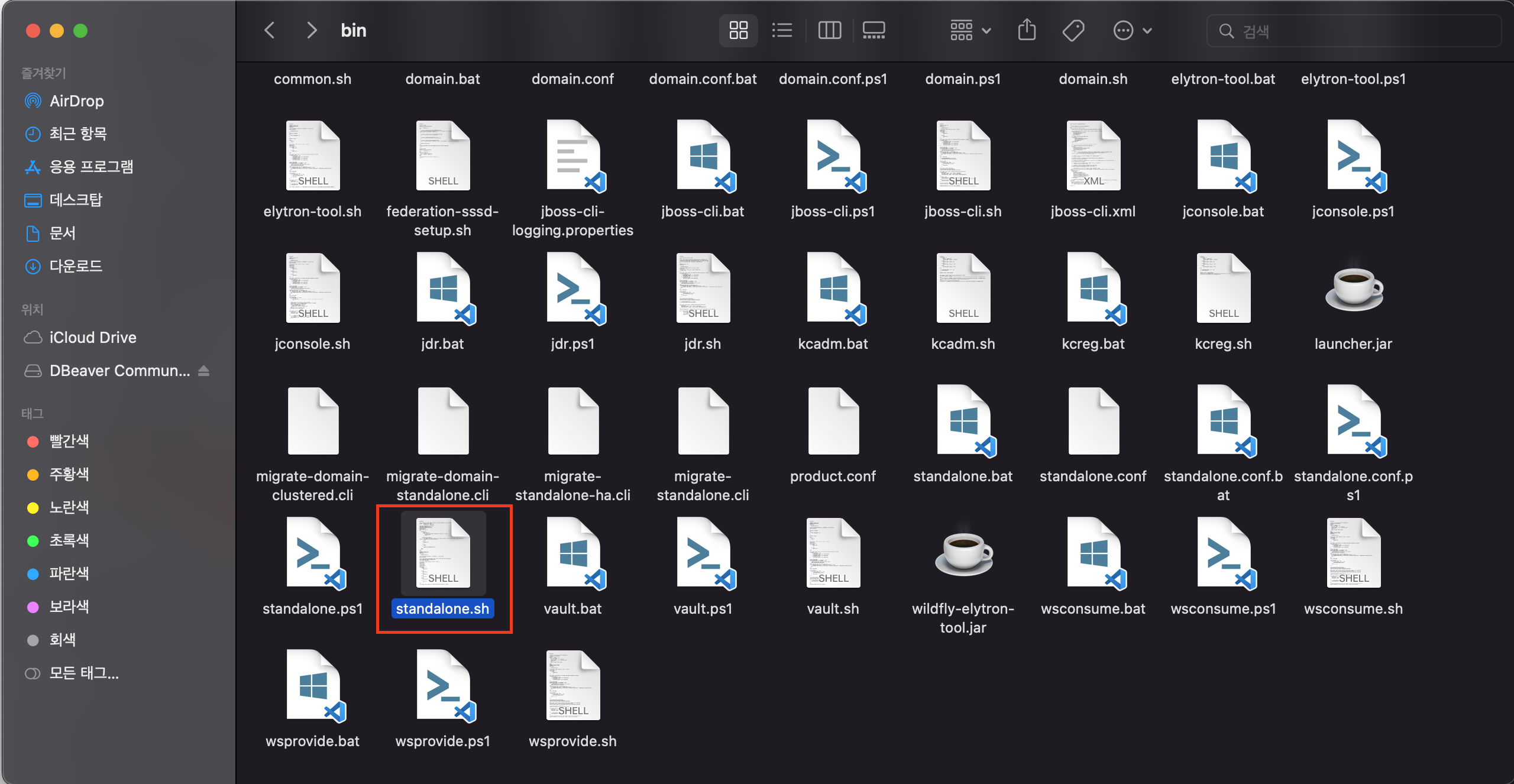 [keycloak - bin] 폴더에 들어가면 standalone 파일이 있는데요 리눅스/맥라면 sh 파일을 윈도우라면 bat 파일을 실행시켜주면 됩니다. 저같은 경우에는 터미널에서 sh 파일을 실행시켜 주었습니다.
