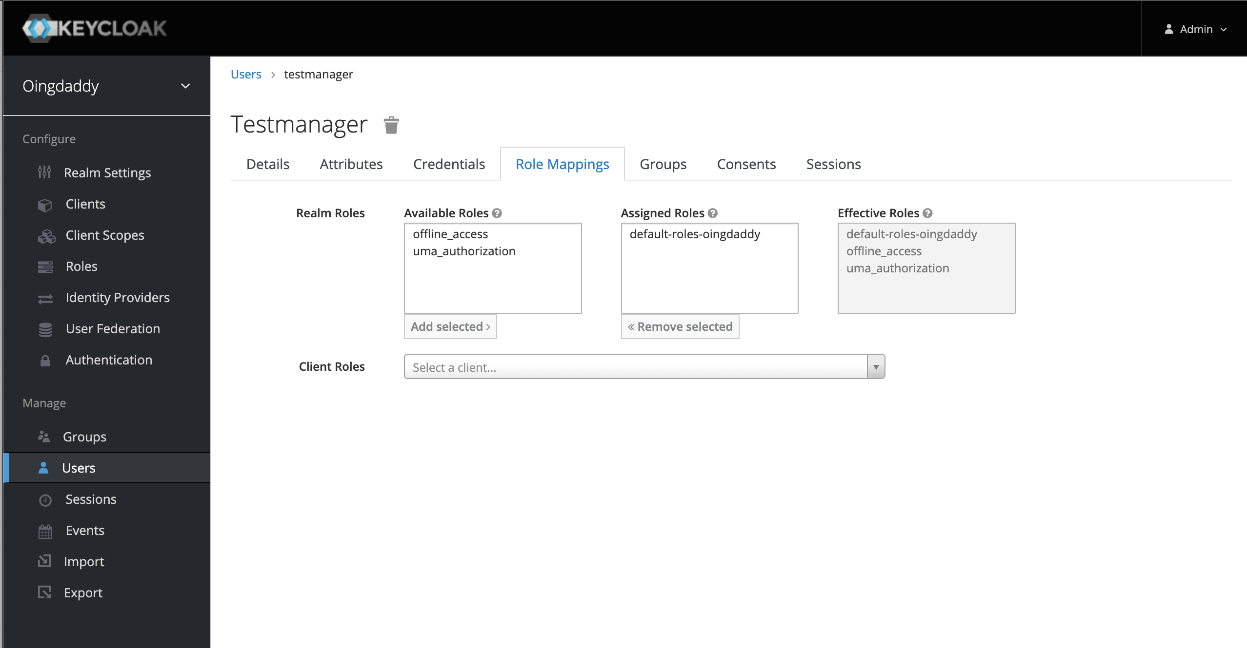 Role Mapping 탭에서 해당 유저의 권한을 설정할 수 있는데 Client Roels에서 생성한 클라이언트를 선택하면 추가할 수 있는 Role 목록들이 나옵니다.