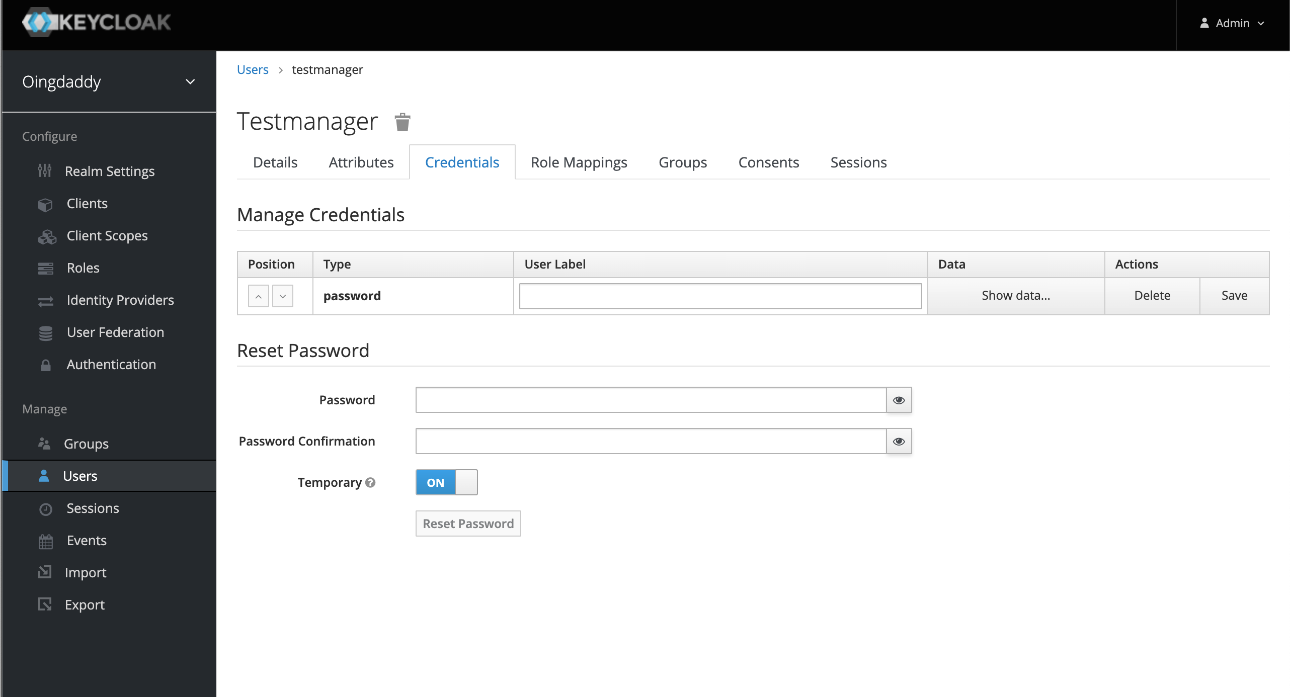 user을 클릭하여 Credentials 탭에서 비밀번호를 선택할 수 있습니다.