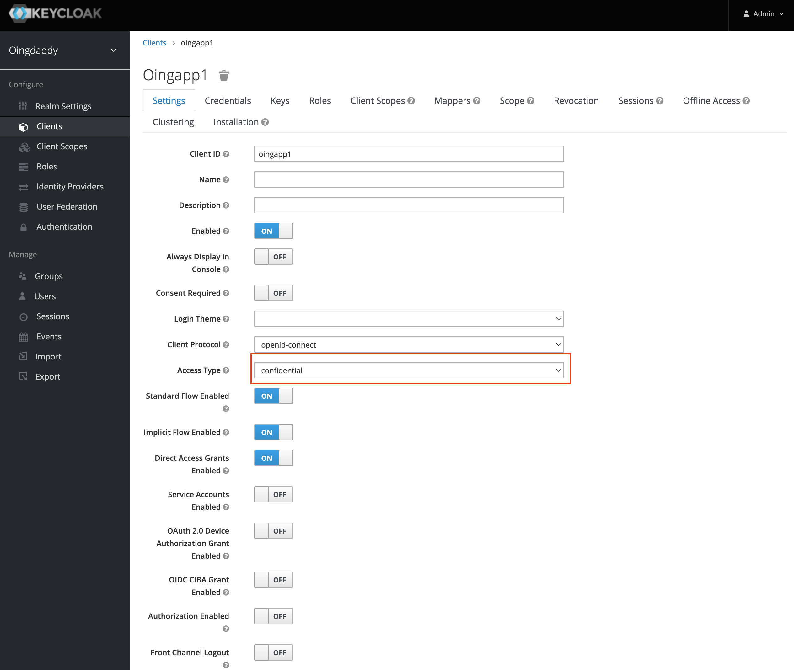client 설정에서 Access type을 confidential로 설정해줍니다. 하단으로 스크롤 하시면 Valid Redirect URIs가 나오는데 보통 해당 클라이언트를 만들 주소를 집어넣습니다. (localhost:8000 주소로 프로젝트를 연결시키려면 이 주소를 넣으면 됩니다) 테스트 단계에서 귀찮으시면 *를 넣어서 모든 경로를 설정해줍니다.