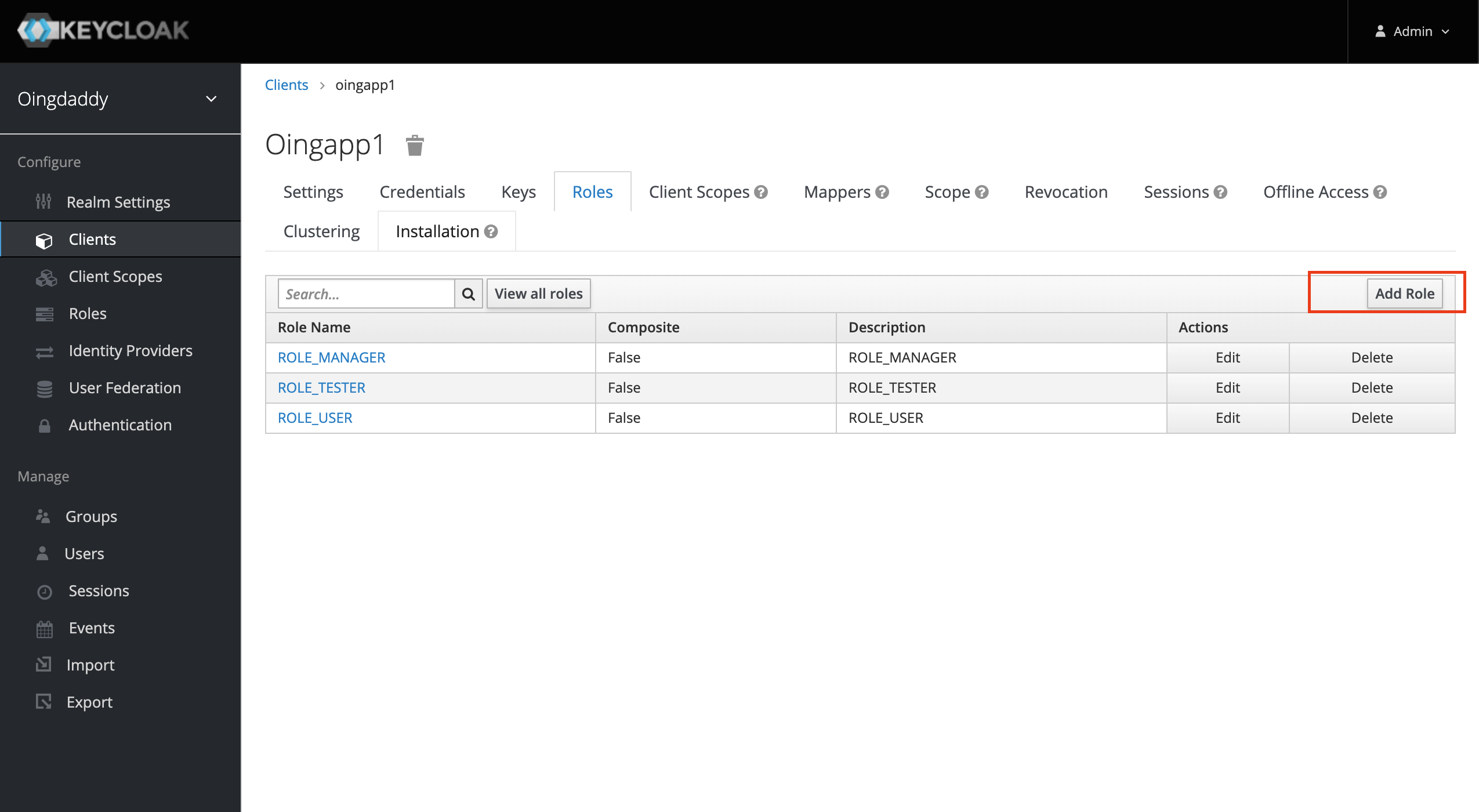 해당 Client의 Role(권한) 종류들을 만들 수 있는데 이는 나중에 User을 등록할 때 해당 클라이언트마다의 role mapping을 할 수 있습니다. add role을 통해 role을 만들 수 있으며 스프링과 연동하는 경우 ROLE_{ROLE 타입} 이런 형식으로 만들면 됩니다.