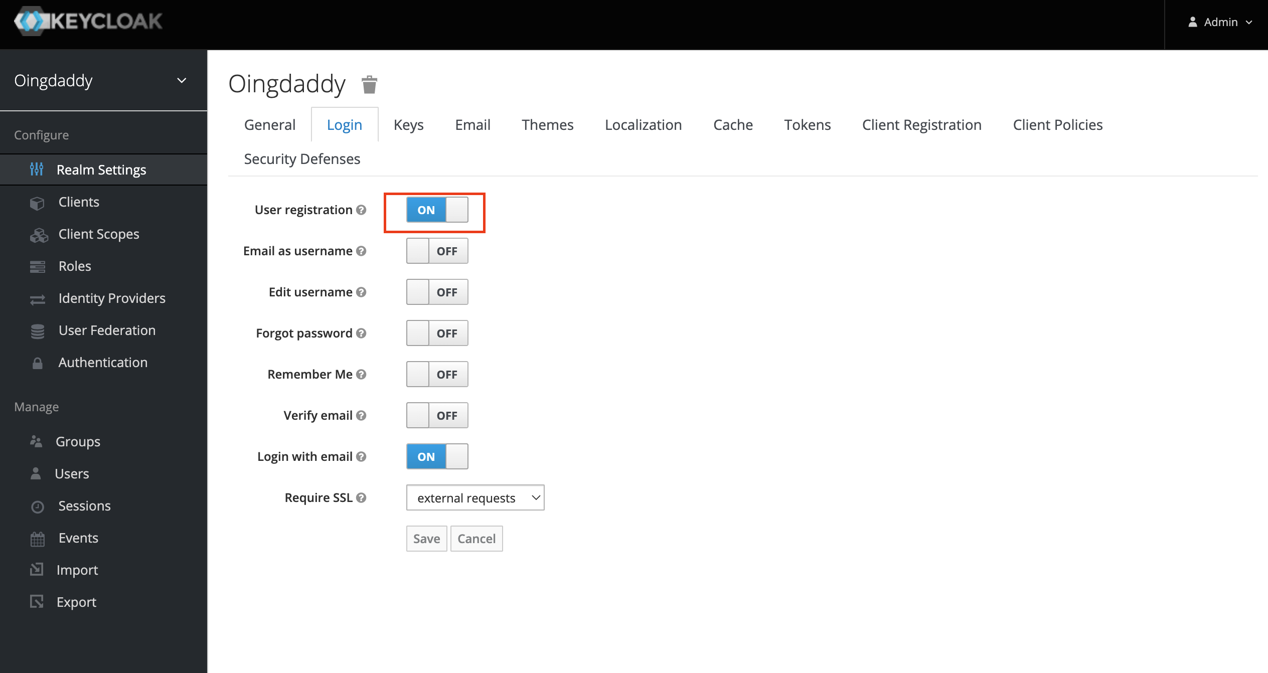 회원가입 부분은 realm 설정에 들어가서 User registeration을 활성화 시키면 로그인 페이지에 회원가입 페이지로 이동할 수 있는 버튼이 하나 생깁니다.